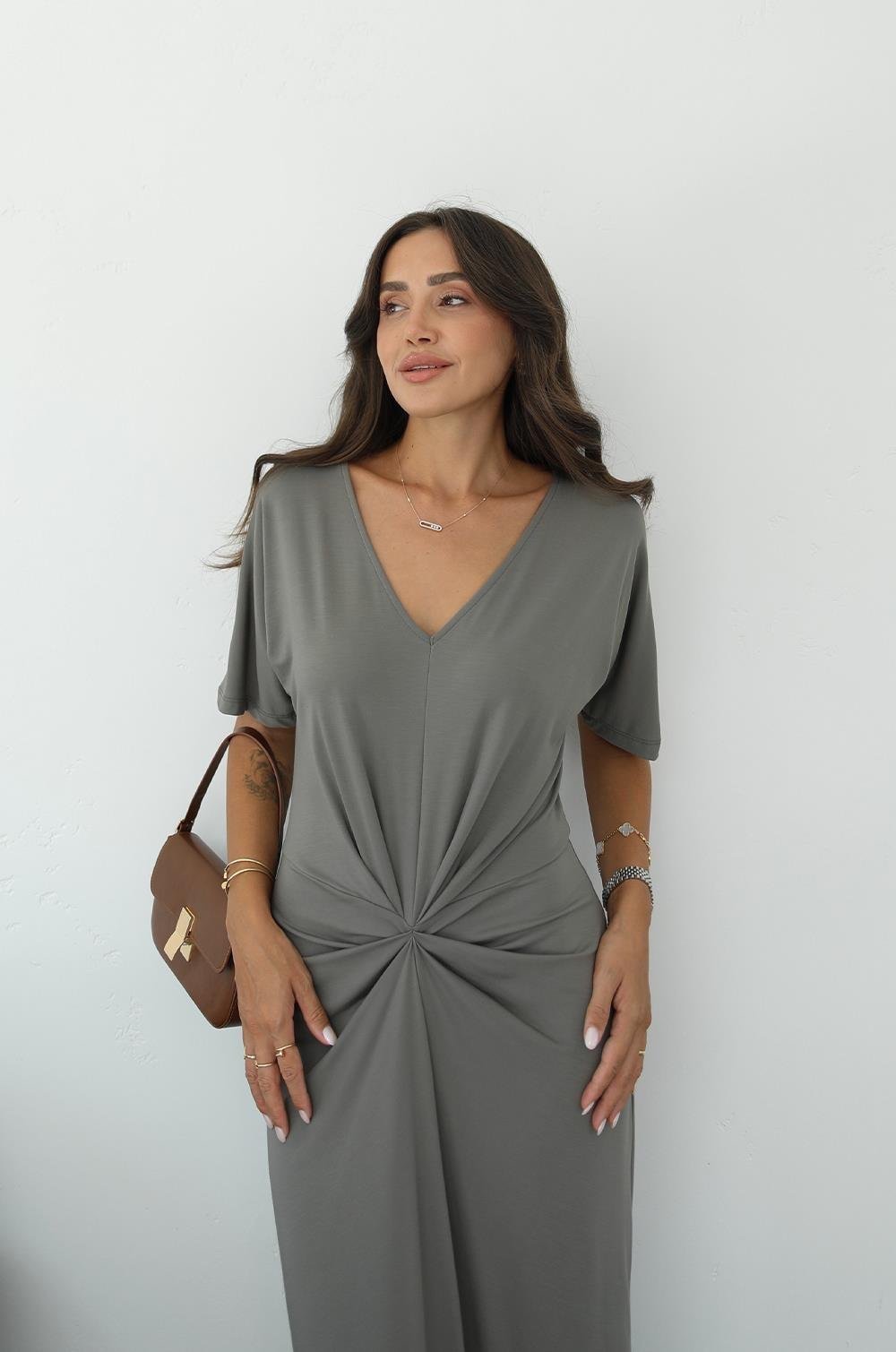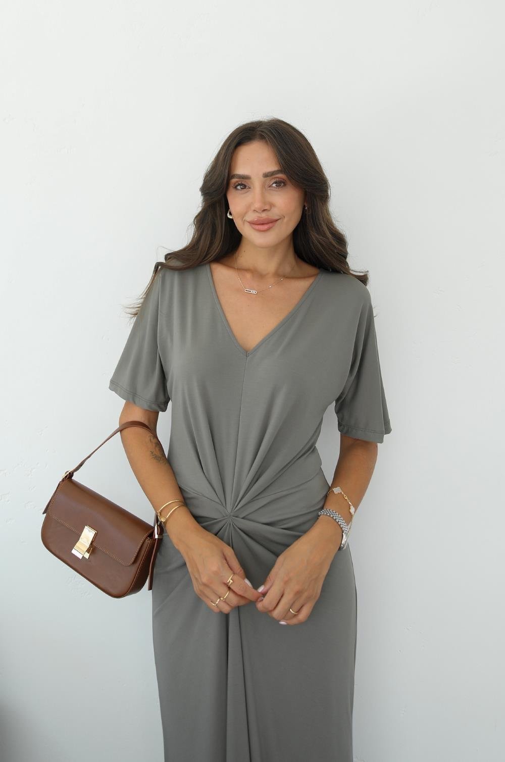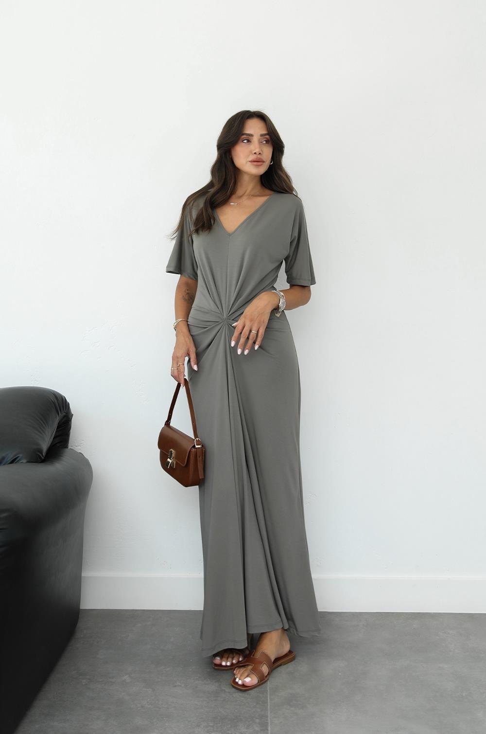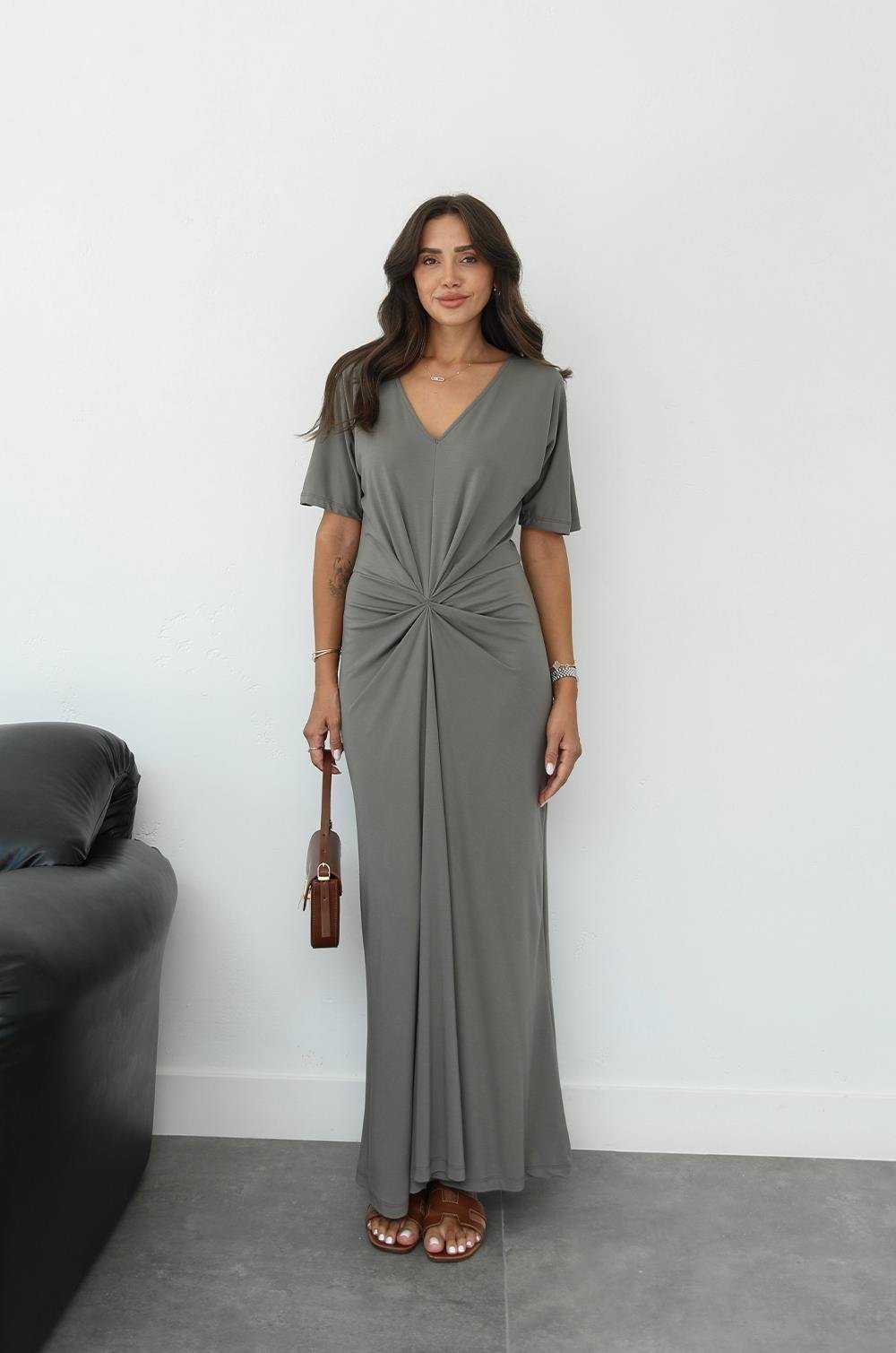 PRODUCT FEATURES SHORT SLEEVE, V-NECK, FRONT RUFFLE DETAIL, LONG MODAL DRESS