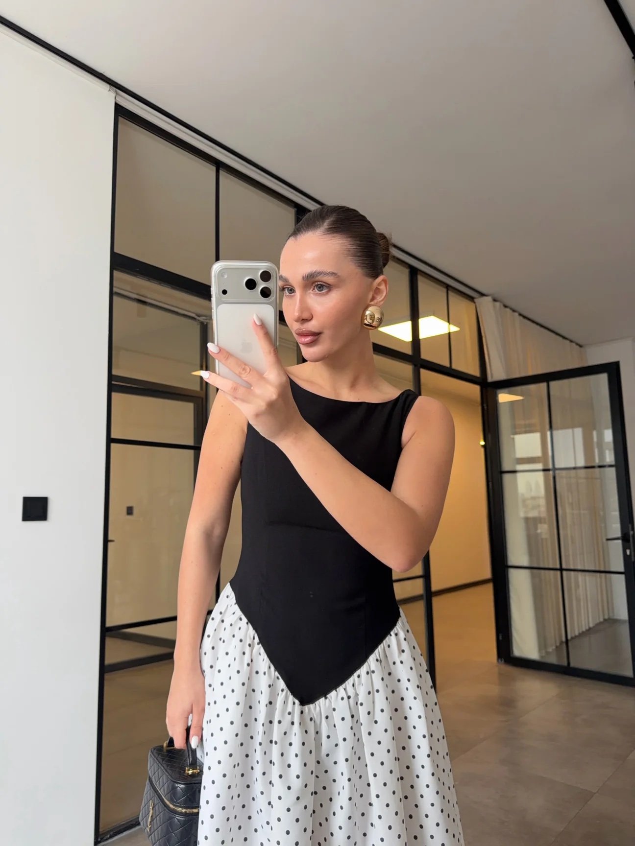 SLEEVELESS, STRAIGHT NECK, BACK ZIPPER, SIDE POCKETS, POLKA DOT SKIRT, LONG DRESS, REGULAR FIT