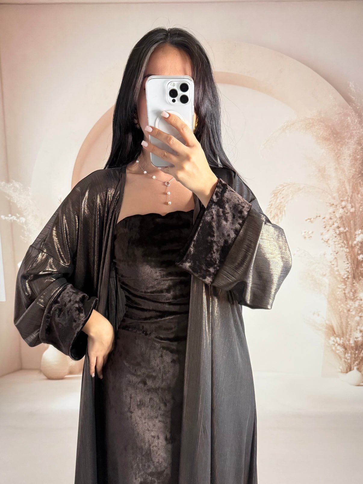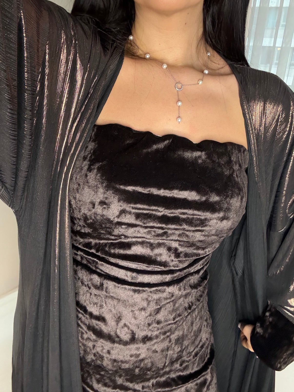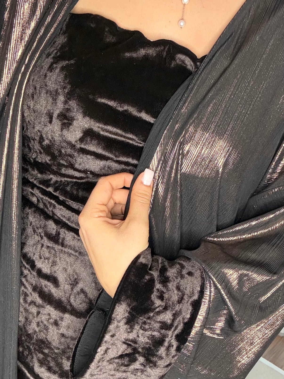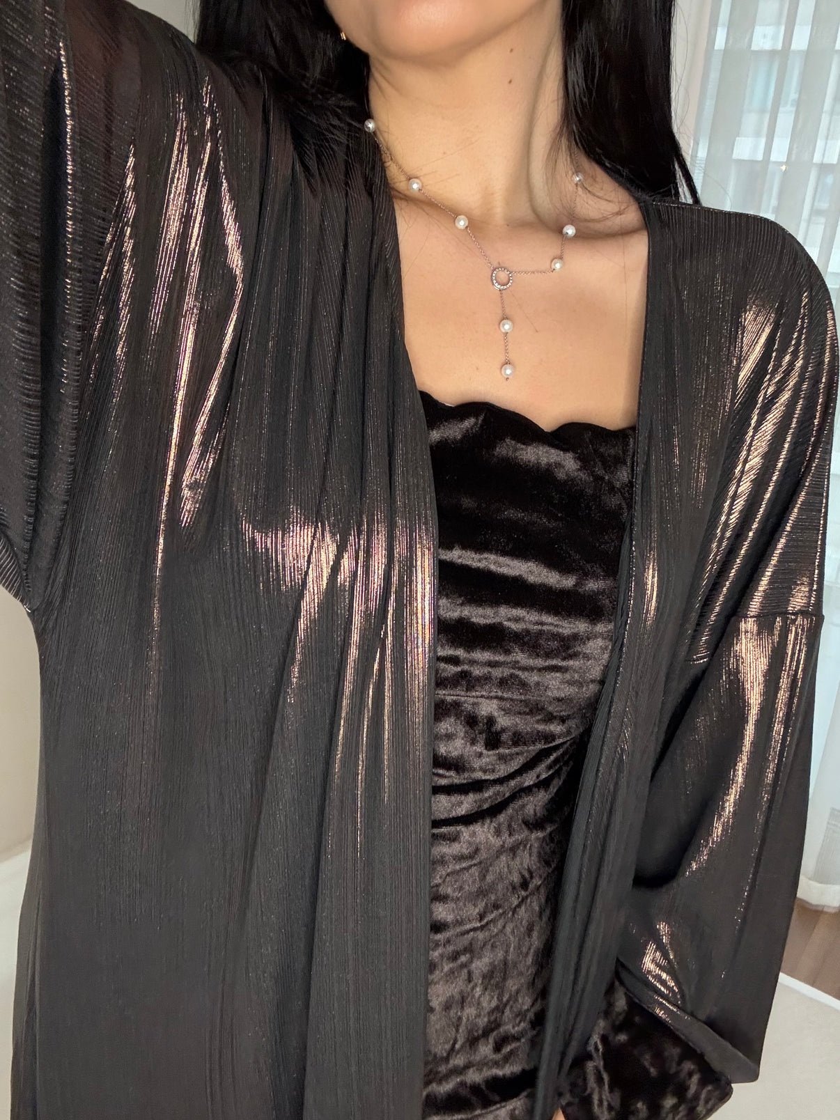 Dress: Velvet Kimono: Foil-printed fabric
