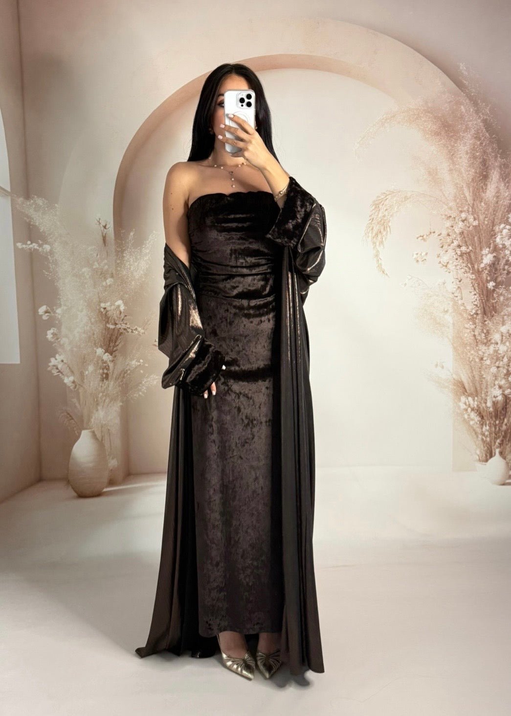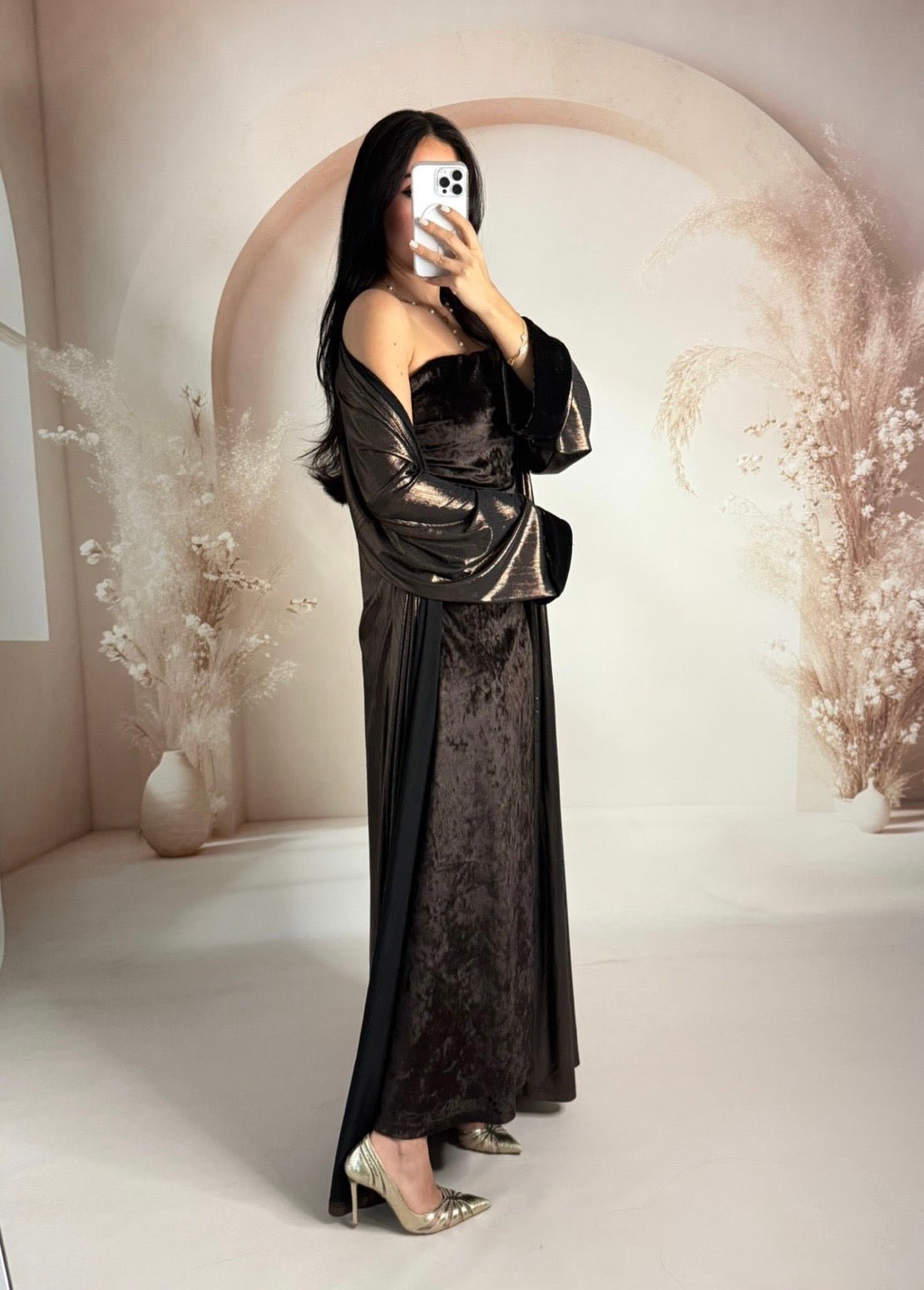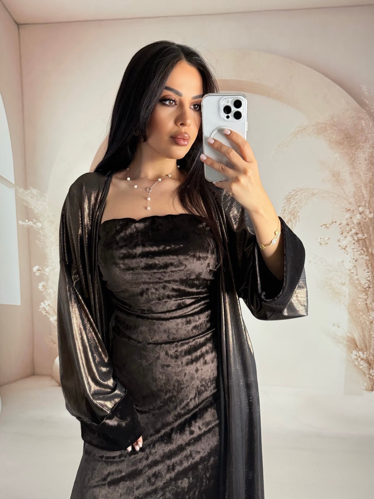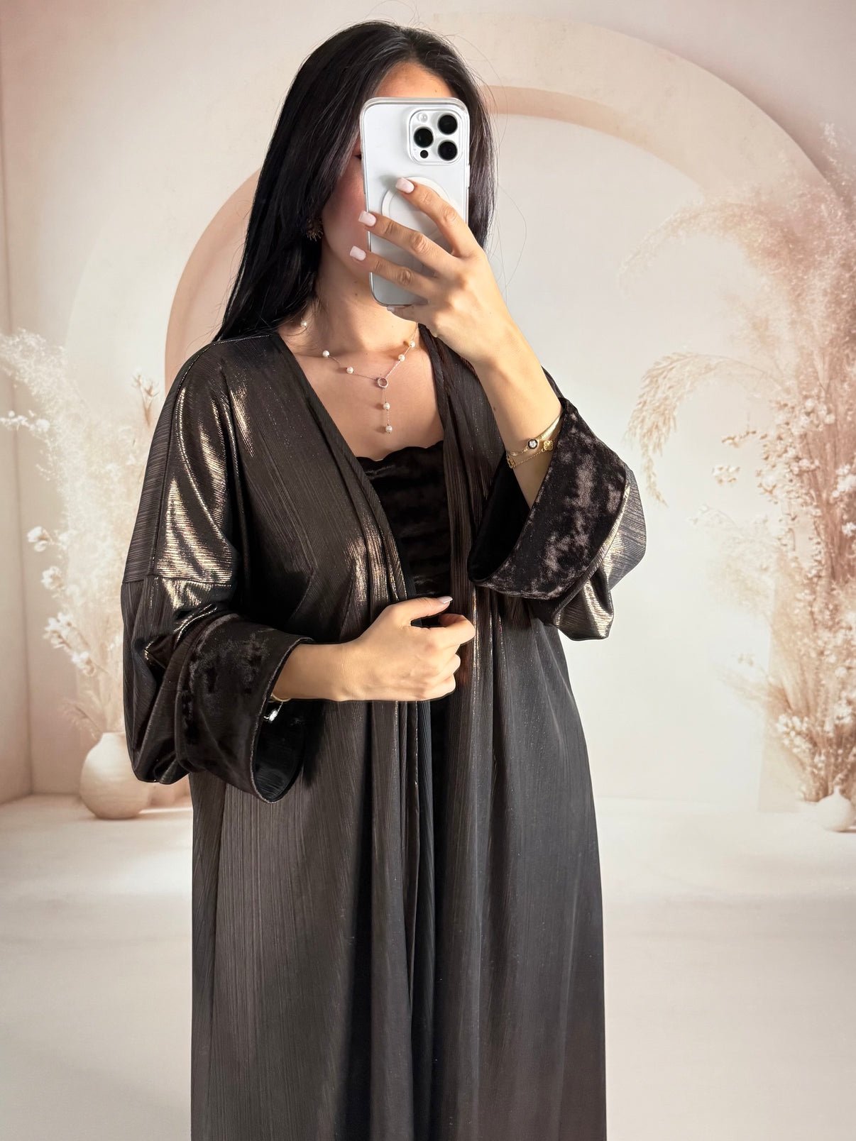 Dress: Velvet Kimono: Foil-printed fabric