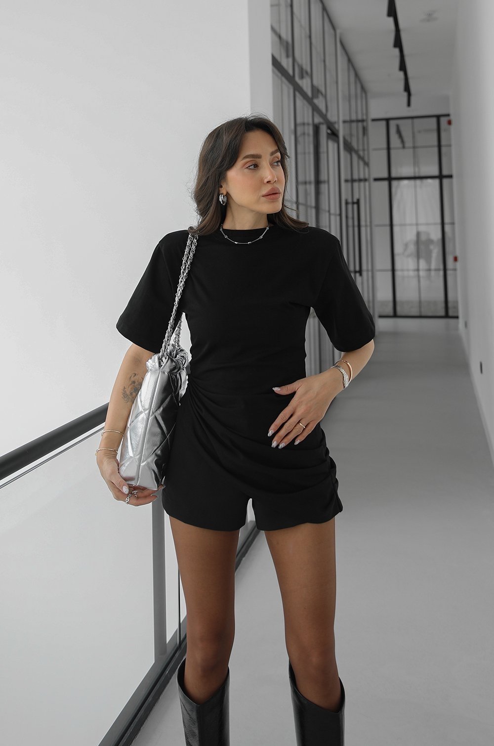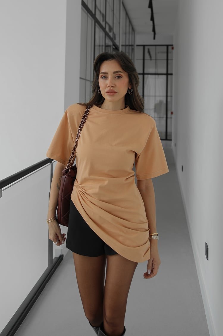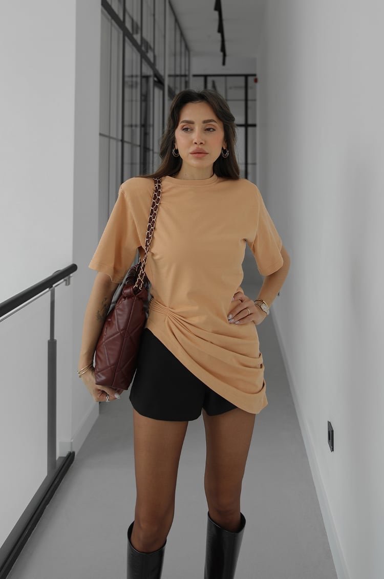 PRODUCT FEATURES: Short-sleeved, padded shoulders, crew neck, side gathered detail, asymmetrical hem blouse. Regular fit. Model Measurements: Model’s height: 166cm / 49kg. Product Composition: 100% Cotton. Product Length: 77cm