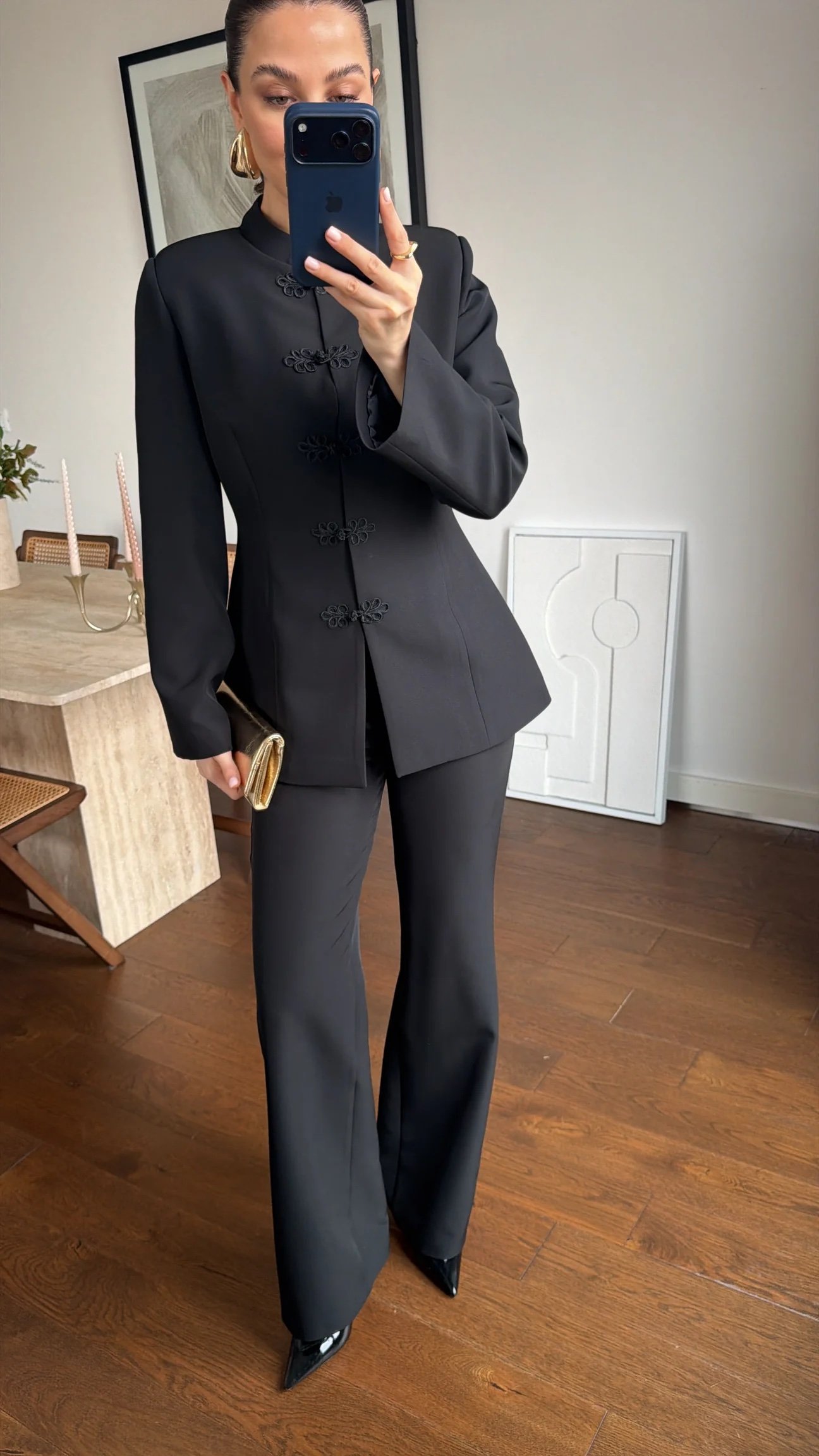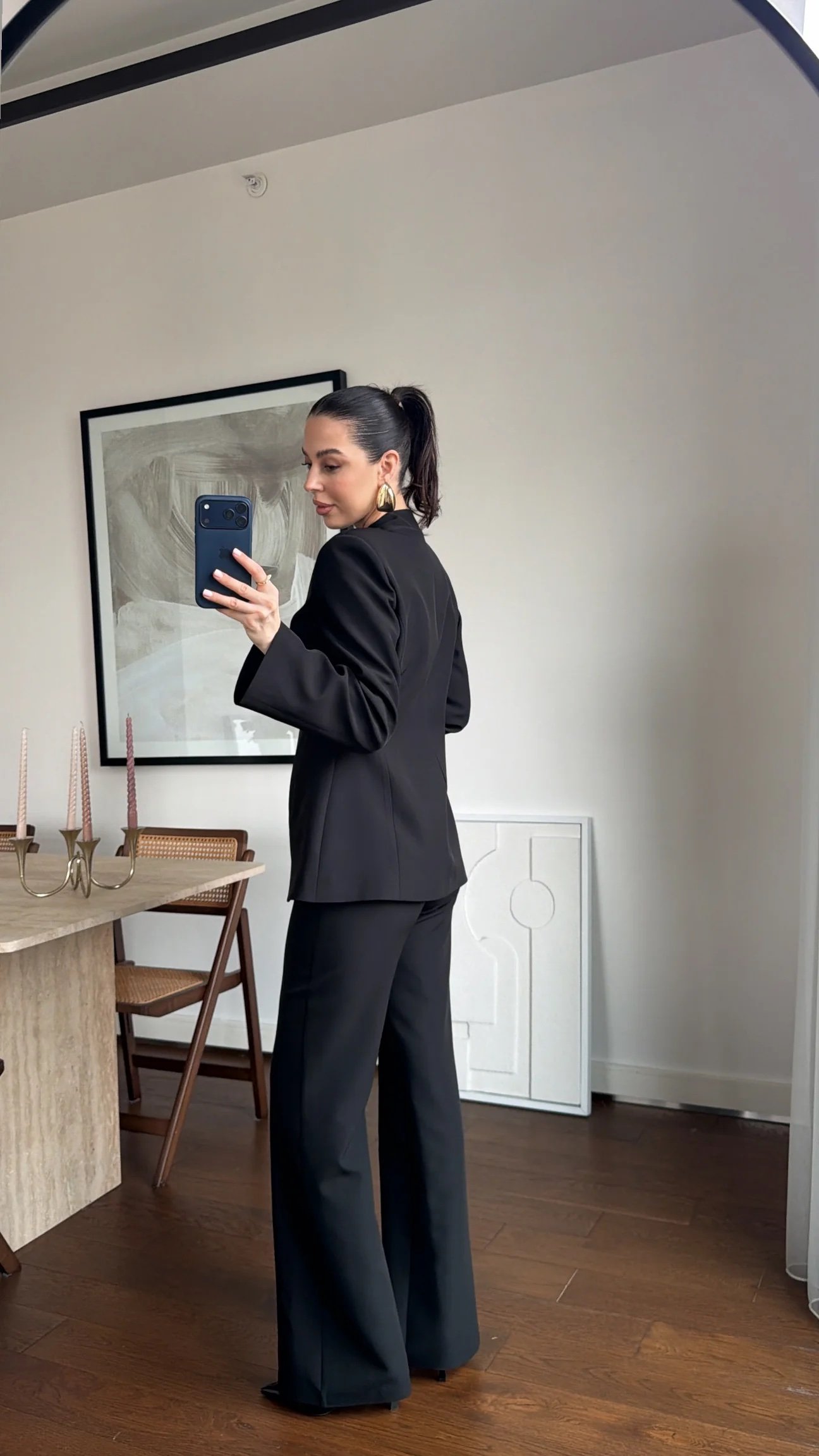 Trousers are high-waisted.