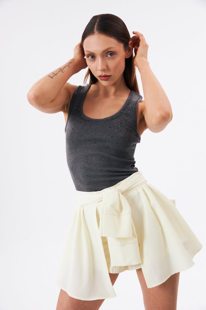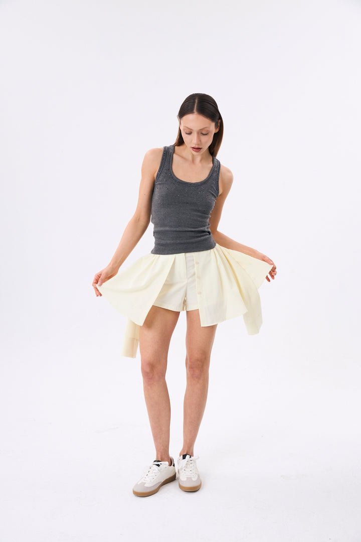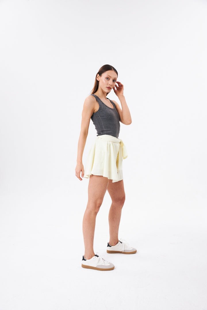 Discover our Luneßyluccia effect skort, designed to elegantly flatter your figure. This innovative style creates the illusion of a shirt tied at the waist, adding a touch of sophistication to your outfit. The integrated belt accentuates your waist, while the two patch pockets on the sides ensure both comfort and style. Perfect for this summer, you won’t want to take it off!